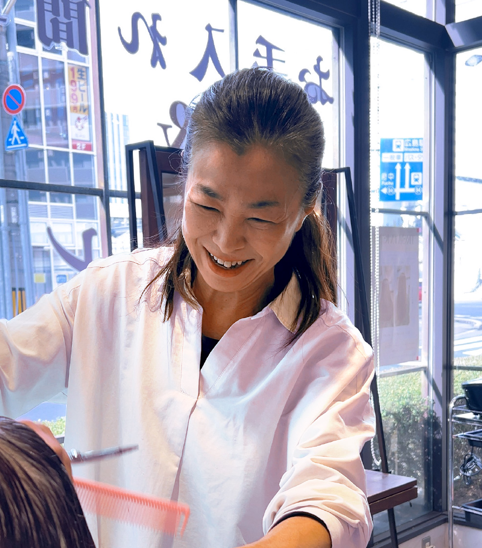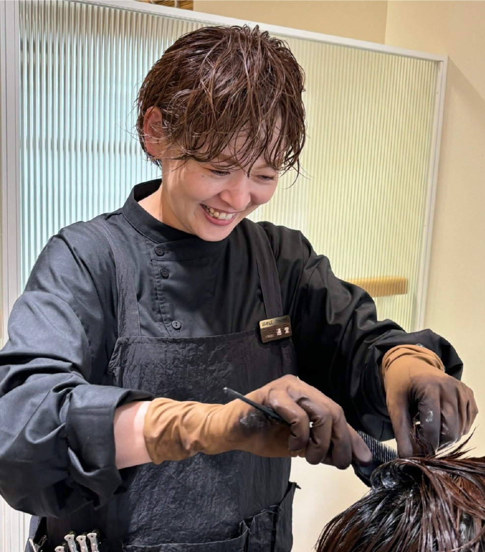 近年、カラー技術は進化し、部分的なハイライト、髪を傷めない定期的な白髪染めや頭髪全体に施すブリーチなど、お客様のニーズも多様化。それに伴い、我々に求められる技術も高難度化しています。私はハサミを握ってお客様の髪型を変えることは出来ませんが、カットでは表現できないようなお悩みを解決したり、肌色をもっとキレイに見せるご提案が出来たりと、カラーリストならではの付加価値に喜びを感じています。いつも頂く、「いてもらわなくては困る」という嬉しい言葉が私の励みになっています。